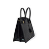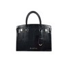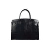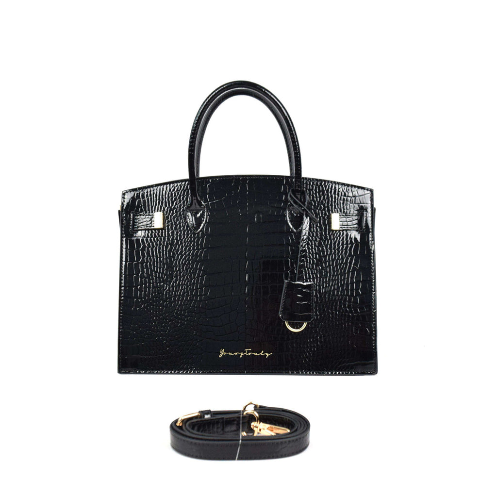 The handbag is crafted in black and shiny